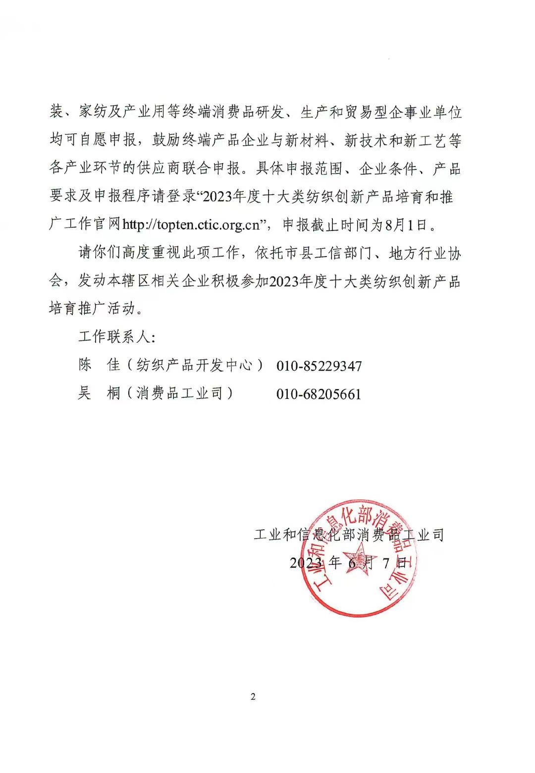 关于开展2023年度十大类纺织创新产品培育和推广工作的通知